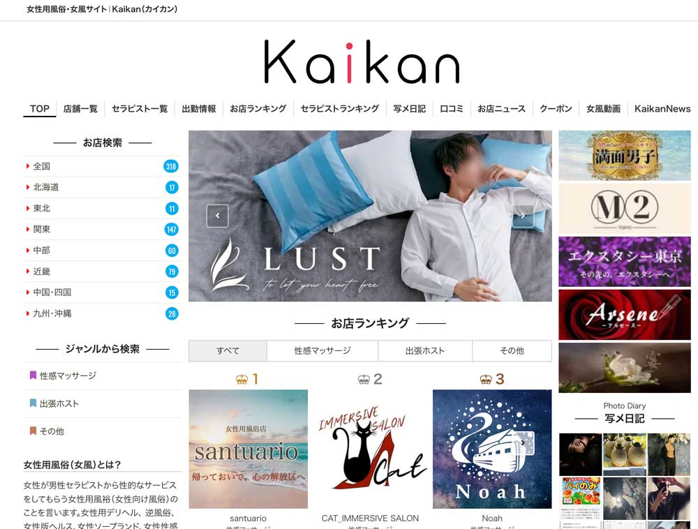 Kaikan(カイカン)は、女性用風俗の老舗ポータブルサイト。2013年頃から運営をスタート。女性用風俗が流行する前から非常に人気が高く、大手の老舗と呼ぶのに相応しいポータブルサイトになっています。