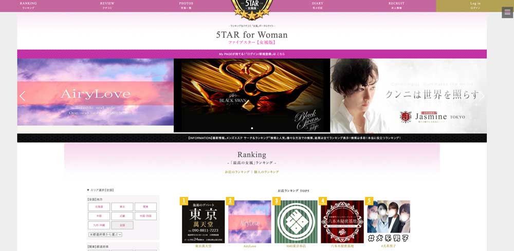 日本全国の女性用風俗の店舗情報や予約も可能。お得に利用できるクーポンや女風動画も非常に人気の高いコンテンツとなっています。